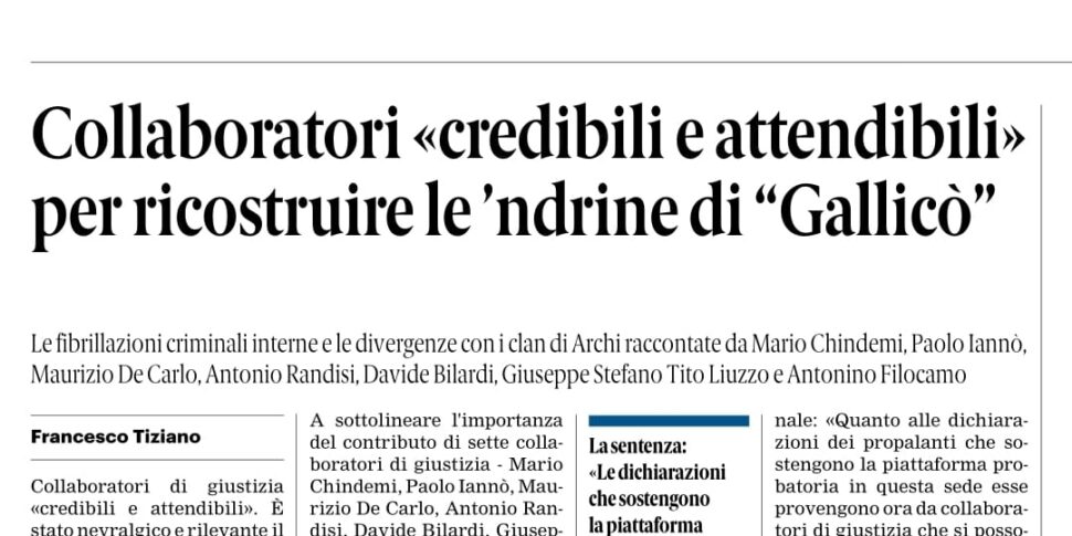 Collaboratori di giustizia «credibili e attendibili» . È stato nevralgico e rilevante il contributo fornito dalle dichiarazioni di un gruppo di ex esponenti della ’ndrangheta di Reggio-città per sostenere l’accusa nel processo “Gallicò” , l’indagine della Procura antimafia che ha smantellato un presunto gruppo mafioso coinvolto nelle dinamiche criminali della popolosa frazione a nord...